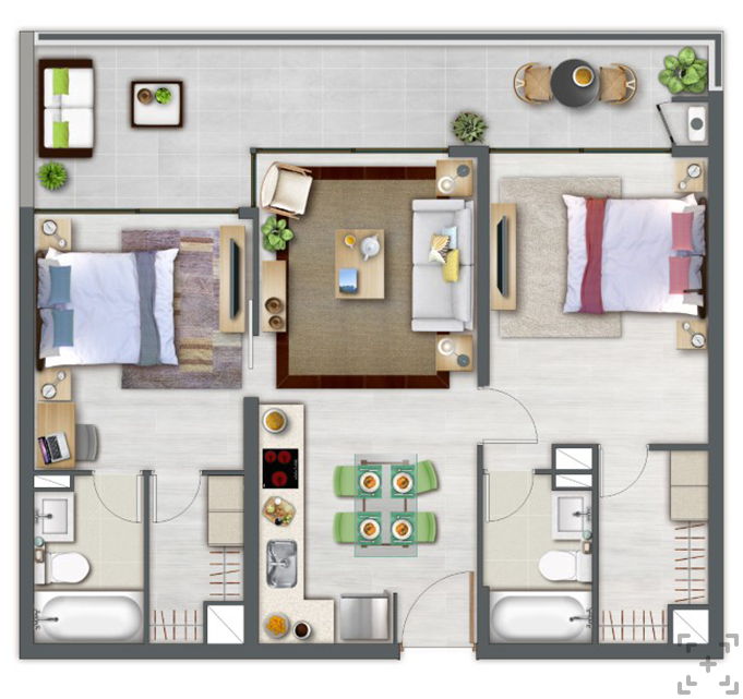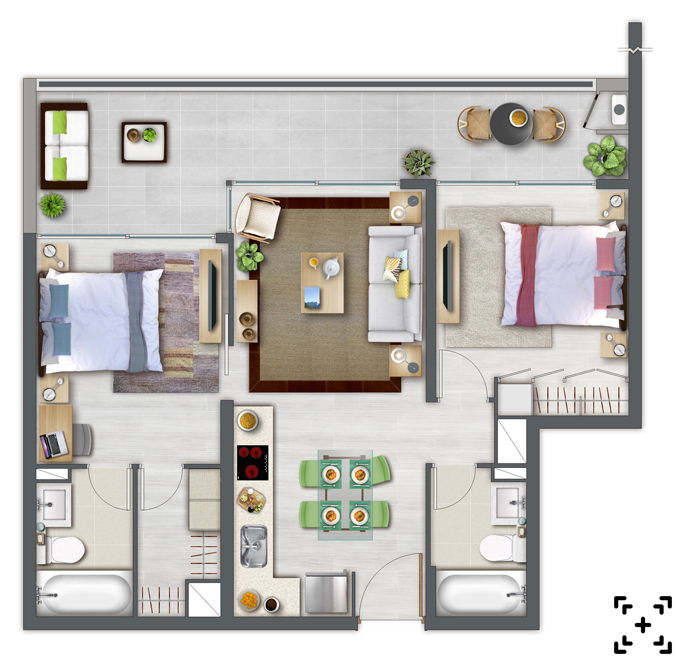 Increíbles dormitorios con terraza. Depto. 405 de 2 Dorms.